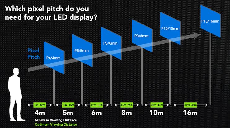 Depending on viewing distance suitable screens are selected . For example - P10 is the low cost products as difference between two led lamp is 10 mm. P10 is mostly preferred at height of above 8-10 meter. While P2.5 is the high cost product as difference between two led lamp is 2.5 mm . It gives high resolution display and can be seen from 2.5 meter.